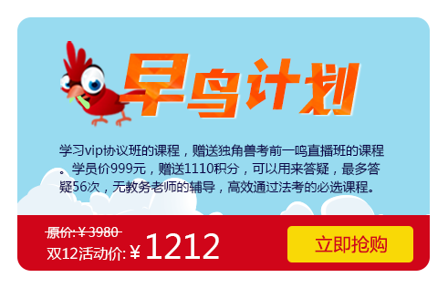 早鳥計劃班(一學年制):VIP協議班課程(無教務老師輔導,無八寶書籍資料,但含一鳴直播班),答疑55次,通過法考的必修課程系統復習,順利實現自己的夢想! 樓老師:男,2017年中國人民大學法律碩士(法學)筆試專業課第一。獨角獸網校438分過關學員,對法考命題方向與出題思路有深入研究,現任獨角獸網校教務老師。