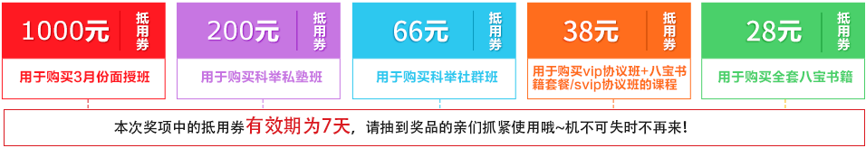 ③抵用券只用于購買相應班次、書籍、套餐,有效期為7天內支付有效,且每張現金券僅限使用一次,不支持累計領取和使用。