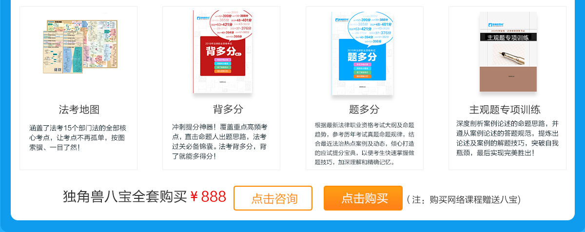金榜集訓班面授時間約4月8日—9月10日結束,該班次包含面授的課程之外,包含對應階段的書籍資料,除此以外,包含了獨角獸最新網絡課程入門導學、真題解析、基礎精講、重點強化、法條串講、考題點評、全真模考、高分論述、沖刺特訓、考前突破十階段的課程,贈2018獨角獸《八寶》書籍資料1套,萬一2018年法考未通過,可以重讀2019年同期面授課程。39800元購買