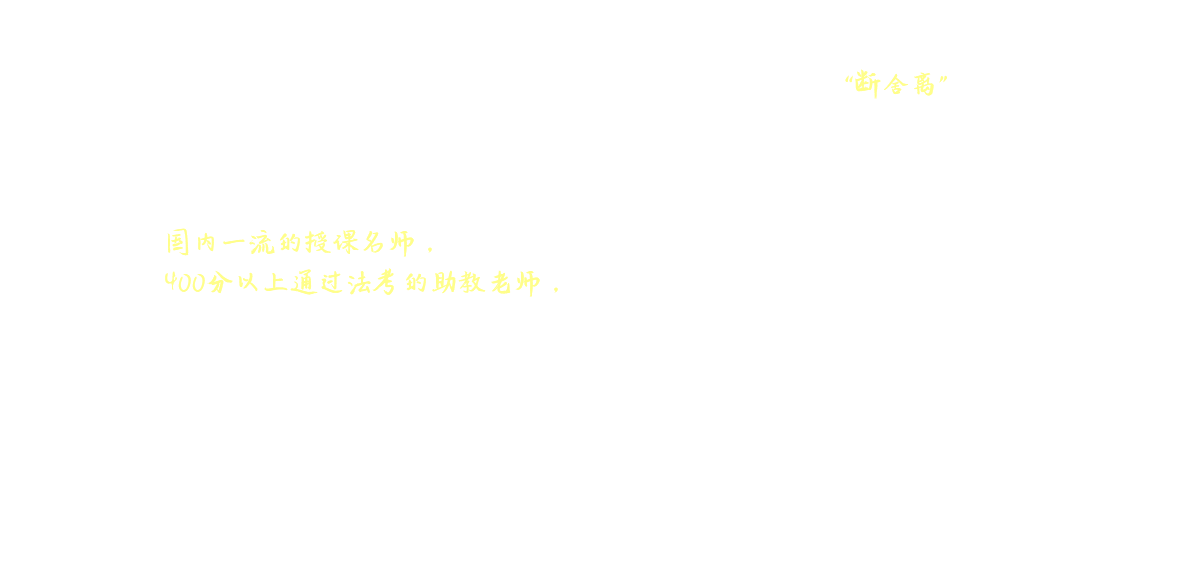 業內實力派專家授課,幫你全面把握客觀題的重點、難點、熱點、必考點,讓你在考前兩個多月的時間里,把握最核心的高頻考點,不求面面俱到,只求用20%的時間掌握80%考點,得70%分數(得分60%即為客觀題過關)。 民法,方志平、陳飛;刑法,方鵬等;行政法,黃文濤;民訴法,蔡輝;刑訴法,左寧;商經法,張海峽;理論法學,白斌、楊帆;三國法,李毅。此外,還有一些不方便介紹的授課老師。 以上老師,限于押題信息的敏感性,有些老師不方便大規模宣傳介紹,有的可能你不太熟悉,但是絕對都是業內實力派押題專家,在最后的兩個多月里,這些老師一定會讓你獲益匪淺,一定會讓你滿載而歸!