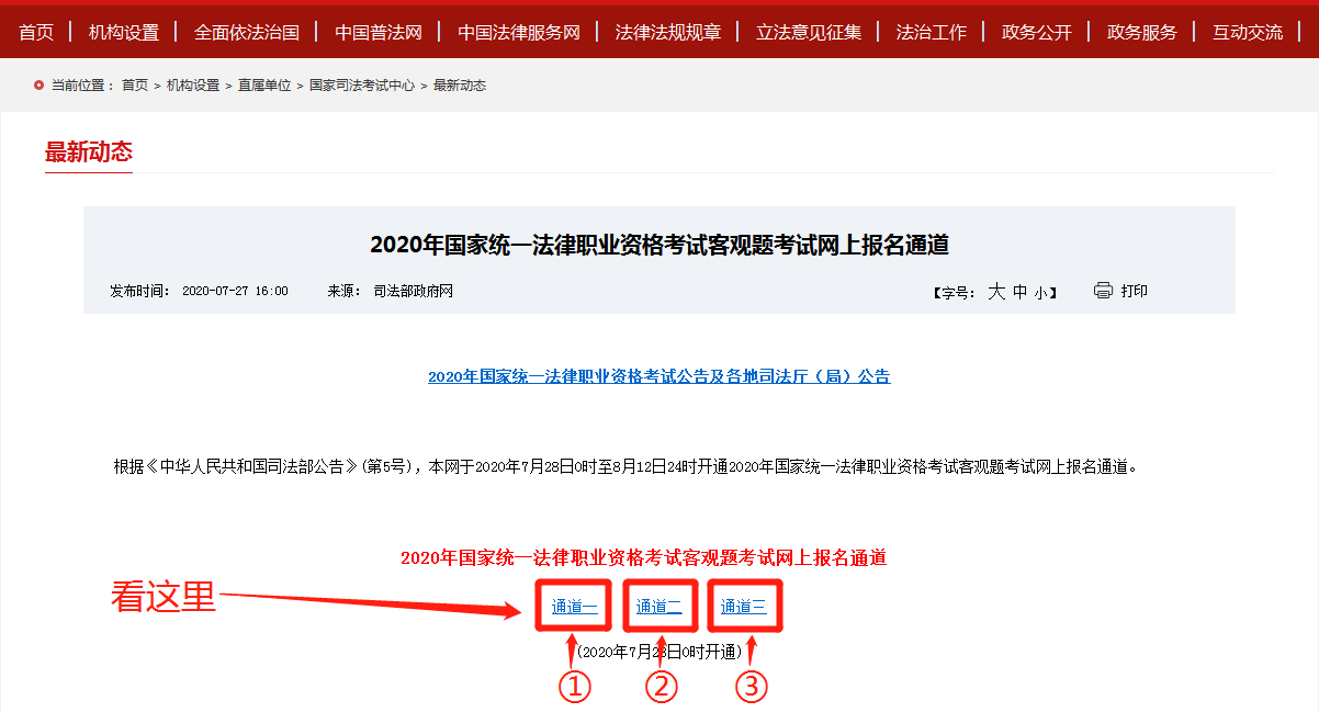 共有三個(gè)報(bào)名通道,目的是分流一下報(bào)名人數(shù),防止瞬間報(bào)名人數(shù)太多,把司法部報(bào)名網(wǎng)站的服務(wù)器拖垮了,隨便點(diǎn)擊其中一個(gè)進(jìn)入,要是進(jìn)不去,換一個(gè)通道再試就行啦。