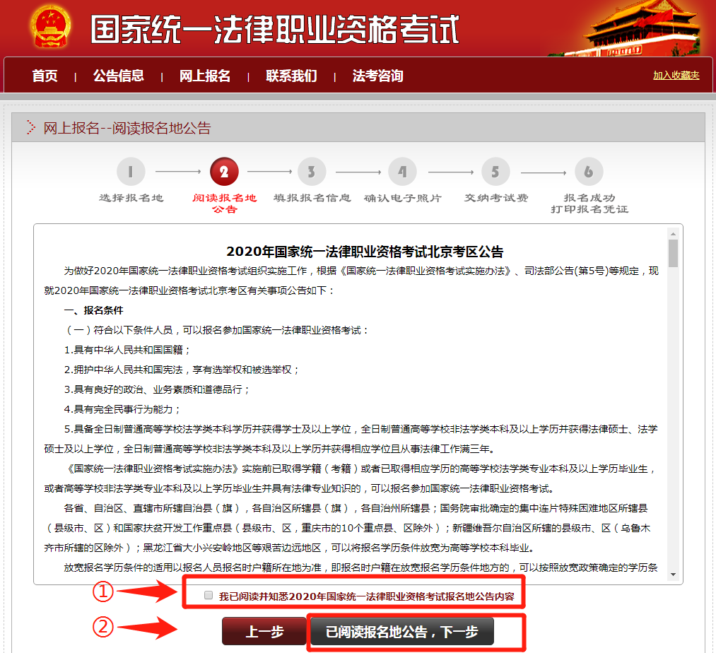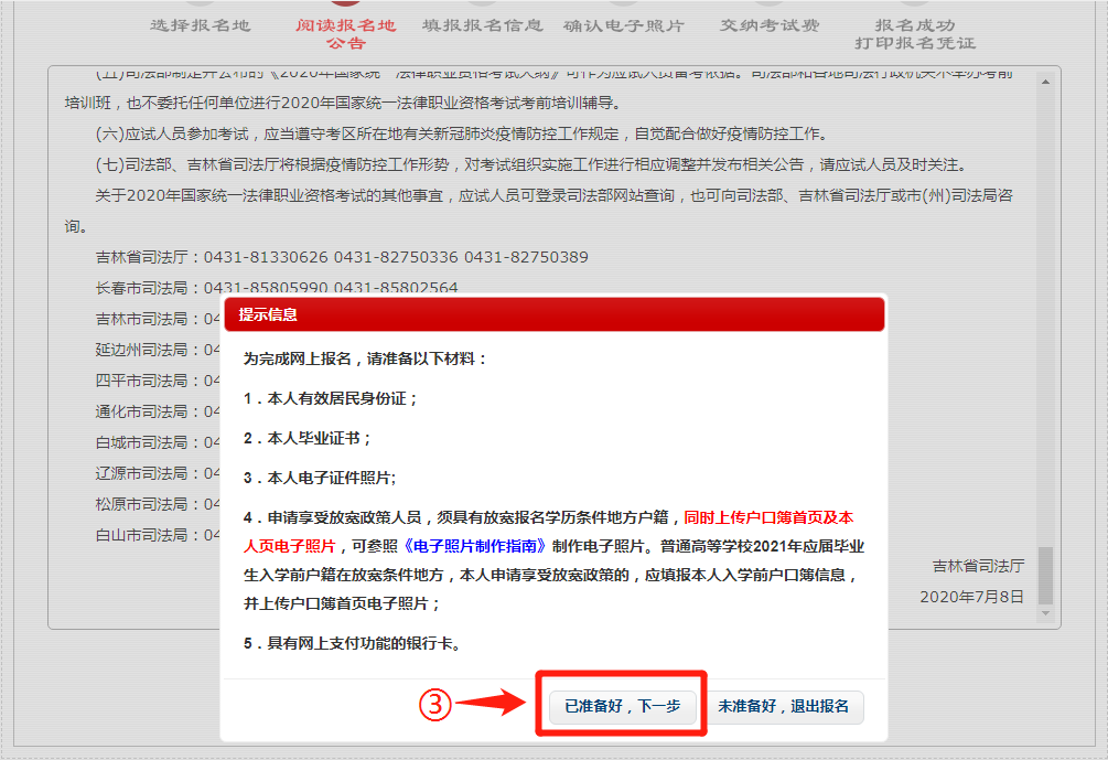 閱讀報(bào)名地公告界面,先勾選①“已閱讀并知悉……公告內(nèi)容”,→ 點(diǎn)擊②“我已閱讀報(bào)名地公告,下一步”,→點(diǎn)擊③“已準(zhǔn)備好,下一步”。