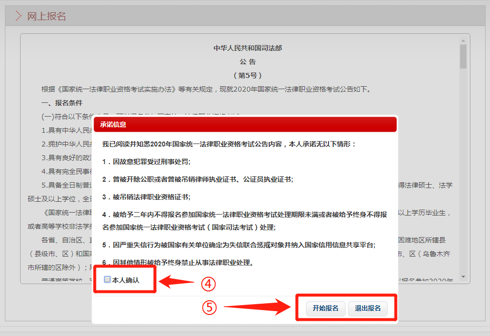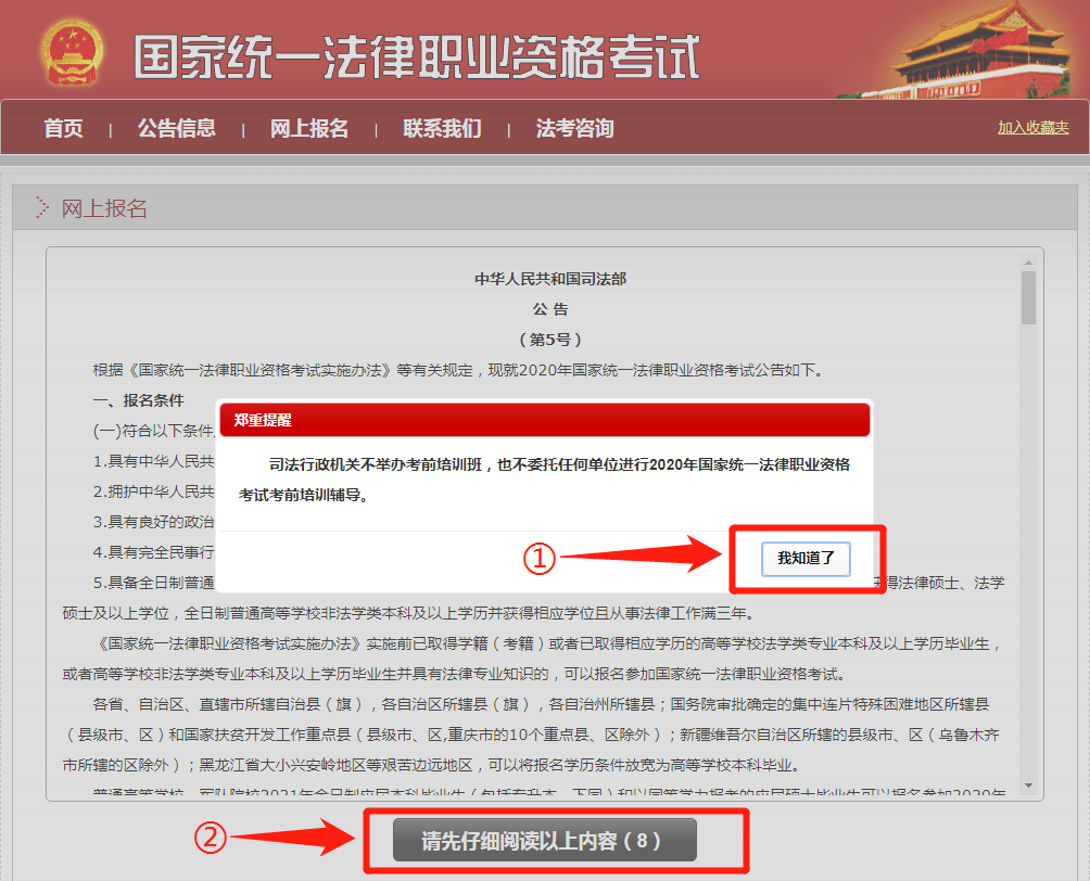 點(diǎn)擊“網(wǎng)上報(bào)名”之后出現(xiàn)的界面 → 點(diǎn)擊①“我知道了” →②閱讀倒計(jì)時(shí)10秒鐘走完后 → 點(diǎn)擊③“已閱讀以上信息,下一步” →④勾選“本人確認(rèn)” → 點(diǎn)擊⑤“開(kāi)始報(bào)名”。