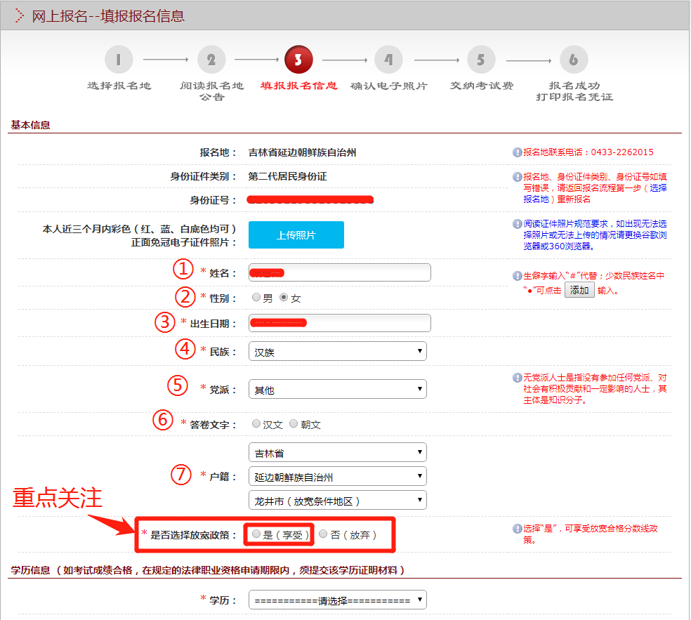 選擇享受放寬政策后,會(huì)彈出以下信息欄,如實(shí)填寫(xiě)即可;需要注意的是戶口薄首頁(yè)和本人頁(yè)需要合成一張照片上傳。再有就是軍人也是在這一欄選擇:現(xiàn)役軍人。