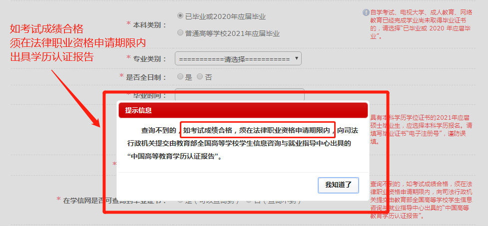 問(wèn)題一:已畢業(yè)但學(xué)信網(wǎng)查詢不到畢業(yè)證書(shū)的,如考試成績(jī)合格,須在法律職業(yè)資格申請(qǐng)期限內(nèi),向司法行政機(jī)關(guān)提交由教育部全國(guó)高等學(xué)校學(xué)生信息咨詢與就業(yè)指導(dǎo)中心出具的“中國(guó)高等教育學(xué)歷認(rèn)證報(bào)告”。