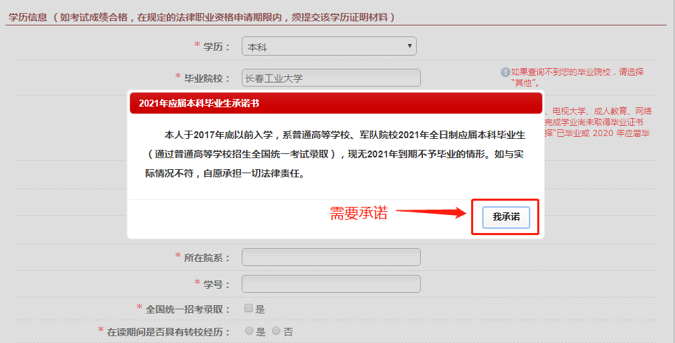 問(wèn)題三:在校大學(xué)生2021年應(yīng)屆畢業(yè)的,在本科類別選項(xiàng)中勾選“普通高校2021年應(yīng)屆畢業(yè)”,而后需要點(diǎn)擊“我承諾”(下圖);確保沒(méi)掛科,可以2021年順利畢業(yè)。