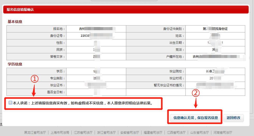 最后一步:勾選①“本人承諾” →點(diǎn)擊②“確認(rèn)信息無(wú)誤,保存報(bào)名信息”,然后就等審核啦!