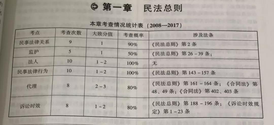 一個考點的考查概率對于考生通過考試是很重要的,但是一個題一個題的翻閱,統計不同題中相同的知識點,對于極大多數考生來說是難以實現的,不僅僅是浪費時間,對于一些知識點不是很熟悉的考生,找五年甚至十年真題里的知識點是很困難的。因此,為了方便考生更好地掌握歷年真題,記憶知識點,獨角獸教育特邀請各部門法權威名師編寫了歷年真題解析,出版了十年真題分類解讀這本真題書,將考點歸類總結,最近十年的考查次數、大概考查分值、考查概率等都在每一部分前面進行總結,高頻考點一目了然。以民法為例:
