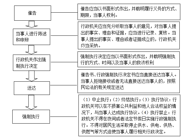 | 催告程序 | 行政機關申請人民法院強制執行前,應當催告當事人履行義務。催告書送達十日后當事人仍未履行義務的,行政機關可以申請人民法院強制執行 |