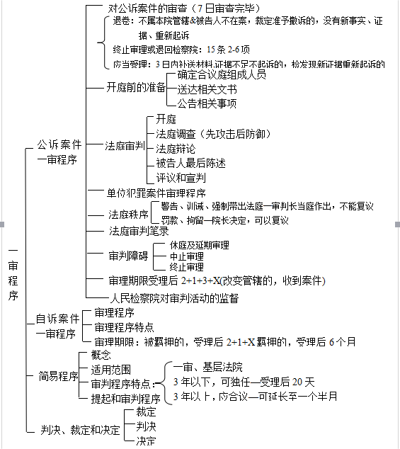 考點提示:公訴案件的審查,法庭審判與秩序,審判障礙,審理期限,檢察院對審判活動的監督;自訴案件一審程序的知識;簡易程序的特點、適用范圍、提起和審判程序。