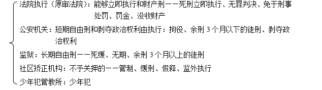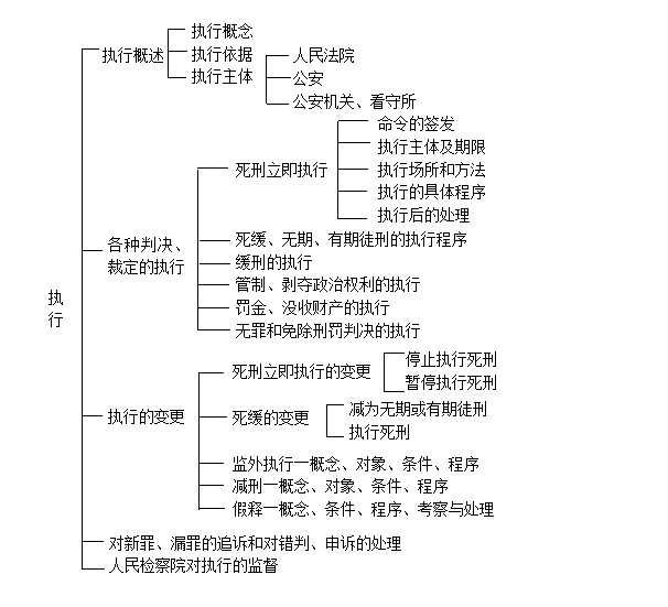 考點提示:執行主體,死刑立即執行,死緩、無期、有期徒刑的執行,緩刑的執行,管制、剝奪政治權利的執行,罰金、沒收財產的執行;死刑立即執行的變更,死緩的變更,監外執行、減刑、假釋,對新罪、漏罪的追訴和對錯判、申訴的處理。