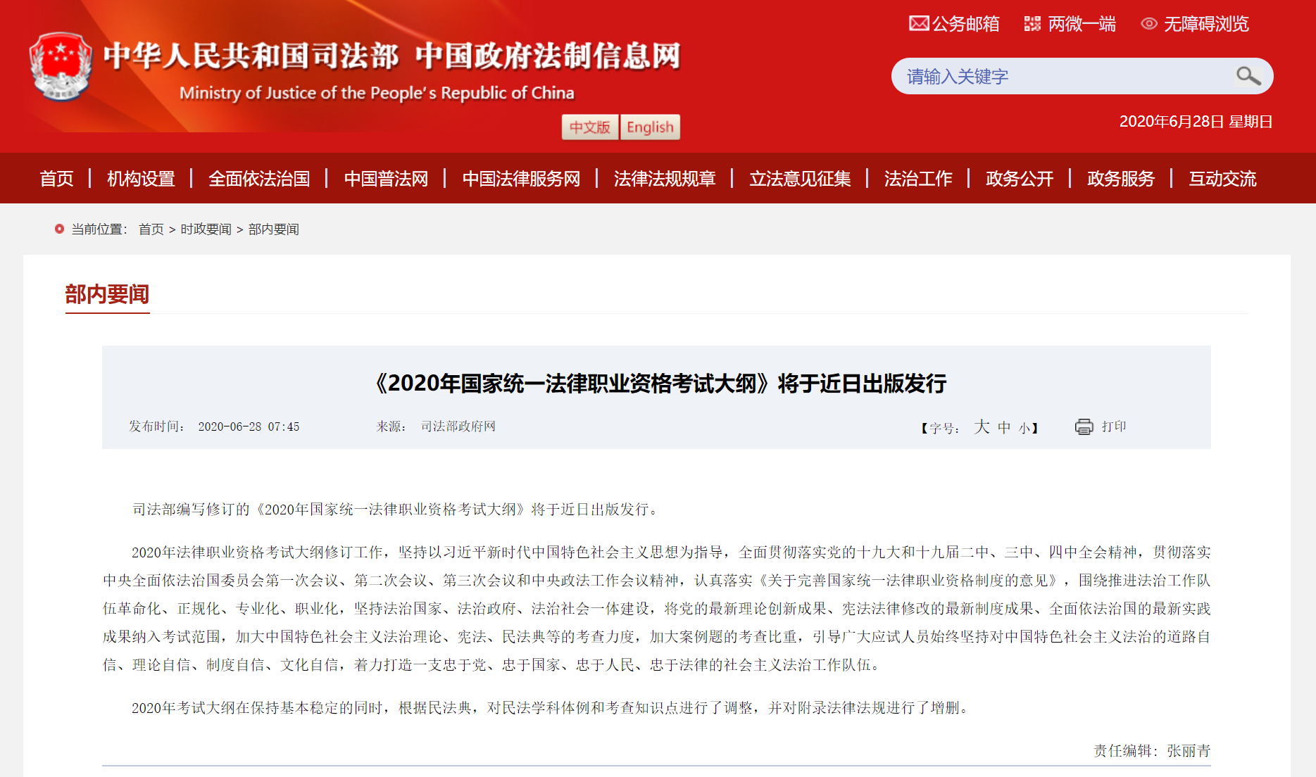 司法部編寫修訂的《2020年國(guó)家統(tǒng)一法律職業(yè)資格考試大綱》將于近日出版發(fā)行。