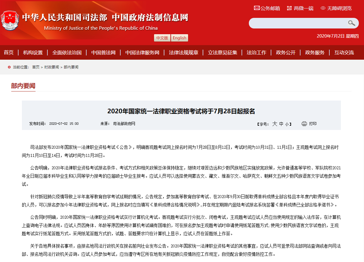 司法部發(fā)布2020年國家統(tǒng)一法律職業(yè)資格考試《公告》,明確客觀題考試網(wǎng)上報名時間為7月28日至8月12日,考試時間為10月31日、11月1日;主觀題考試網(wǎng)上報名時間為11月10日至14日,考試時間為11月28日。