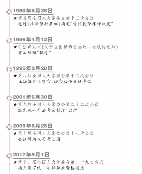 2017年9月1日,十二屆全國人大常委會第二十九次會議表決通過修改檢察官法等八部法律的決定,將應(yīng)當取得法律職業(yè)資格的人員,從法官、檢察官、律師、公證員擴大到從事行政處罰決定審核、行政復(fù)議、行政裁決的工作人員,以及法律顧問、仲裁員(法律類),同時將“國家統(tǒng)一司法考試”修改為“國家統(tǒng)一法律職業(yè)資格考試”。